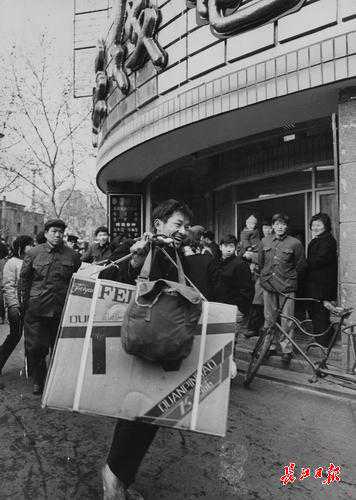 1984年春节前,在汉口江汉路,一个农民“万元户”一口气买了两台黑白电视机用扁担挑回家。记者邓宪陵摄