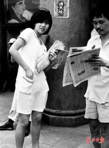1987年8月1日,武汉市天津路口,江汉大学新闻系学生刘文姬,利用暑假勤工俭学卖《武汉晚报》周末版。记者周国强摄
