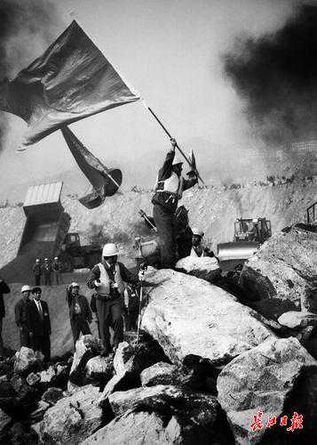 1997年11月8日15时30分,三峡工程大江截流成功,战斗在两岸堤头的建设者率先冲上合龙点的磐石,挥舞红旗。记者邱焰摄