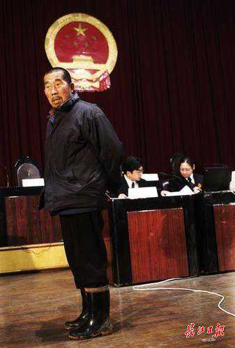 2004年3月25日,江夏区七旬老汉倪灯财,脚蹬一双雨鞋,站在武汉市中级人民法院大法庭上,举证状告湖涠镇政府。这是他第三次将镇政府告上法庭。2004年6月,中院终审判决,湖涠镇政府无偿退还倪老汉的土地。记者金振强摄