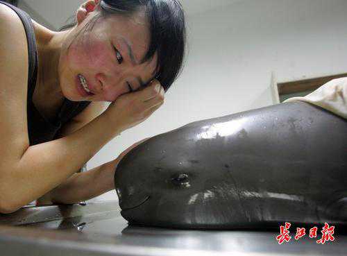 2007年7月11日19时20分,曾创造人工条件下自然繁殖世界首例的江豚“晶晶”,因产后消化系统疾病继发循环衰竭病故。长期观察记录江豚行为、和“晶晶”朝夕相伴的中科院水生所博士武敏痛哭不已。记者高宝燕摄