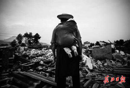 2008年5月12日,四川省汶川县发生8.0级大地震。5月22日,四川省彭州市通济镇桥楼村,59岁的灾民曹良英背着6个月大的孙子罗远航望着被毁的家园。记者邱焰摄
