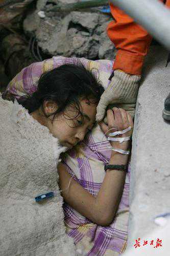 2008年5月15日11时23分,距汶川大地震发生已过去近70个小时。茅坝小学跨塌的教学楼里,一位3天前就已被发现的左腿被卡住的小姑娘一直牵着身边救援军人的手,坚持着自己顽强的生命。记者陈卓摄