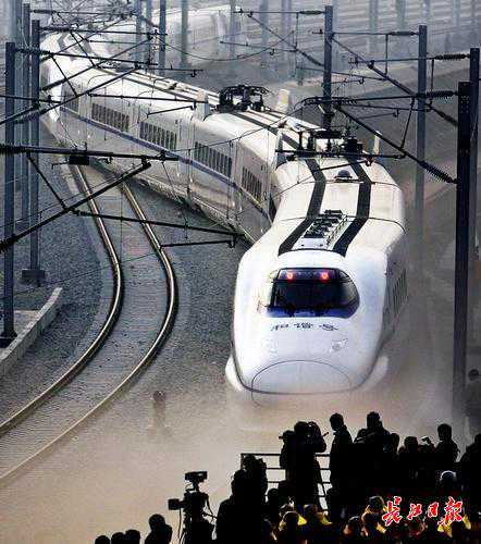 2009年12月26日9时,武广高速铁路武汉至广州北首趟载客动车组G1001次列车从武汉火车站驶出。记者周国强摄