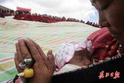 2011年4月14日,玉树地震一周年,玉树扎西大同天藏台的祈福法会上,诵经声让怀抱孩子的母亲得到心灵的慰藉。记者彭年摄