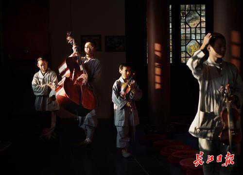 2012年10月1日,湖北省红安县天台寺,僧尼们到寺庙去练琴。这是中国佛教史上第一支全僧人禅乐艺术团,由40多名僧尼组成,年龄在7岁至26岁之间。平日里,他们早晚诵经礼佛,其它时间学习器乐、声乐和舞蹈。记者邱焰摄