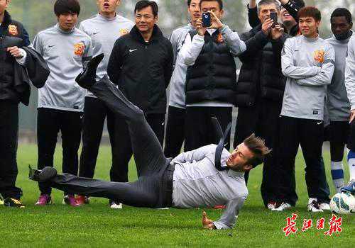 2013年3月24日,贝克汉姆到访武汉卓尔俱乐部,脚穿皮鞋踢定位球时,由于草地湿滑不慎摔倒。记者李葳摄