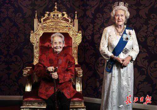 2013年10月11日,武汉市杜莎夫人蜡像馆,“最健康百岁老人”之一,101岁的李先英(左)与伊丽莎白二世的蜡像合影。我国第一个法定的“老年节”前夕,武汉海选出十位“最健康百岁老人”。记者邱焰摄