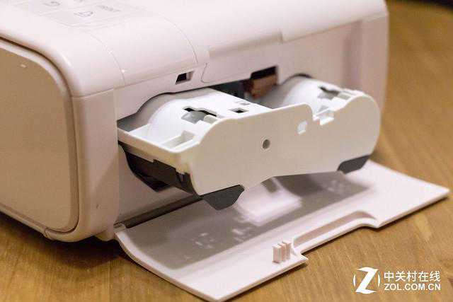 简单了解下外观,接下来就该打印照片了,不过在开始打印前我们需要做一些准备工作。首先将色带插入打印机,注意在放入前要检查一下墨水纸是否拉紧,不能出现松弛的情况。佳能SELPHYCP1200用的是热升华打印原理,相比喷墨、激光而言,热升华打印的耗材成本更低,同时照片的色彩还原也更加准确,适合输出高质量的照片。
