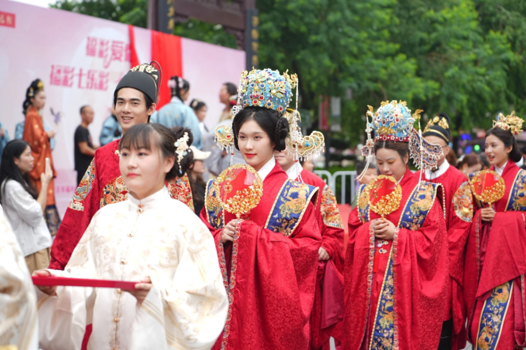 26对新人身着明制传统婚服,在赞者的引导下,行揖让礼、却扇礼、三拜礼、执手礼,饮合卺酒,互赠信物,来了一场穿越千年、极具传统文化特色的浪漫之礼。