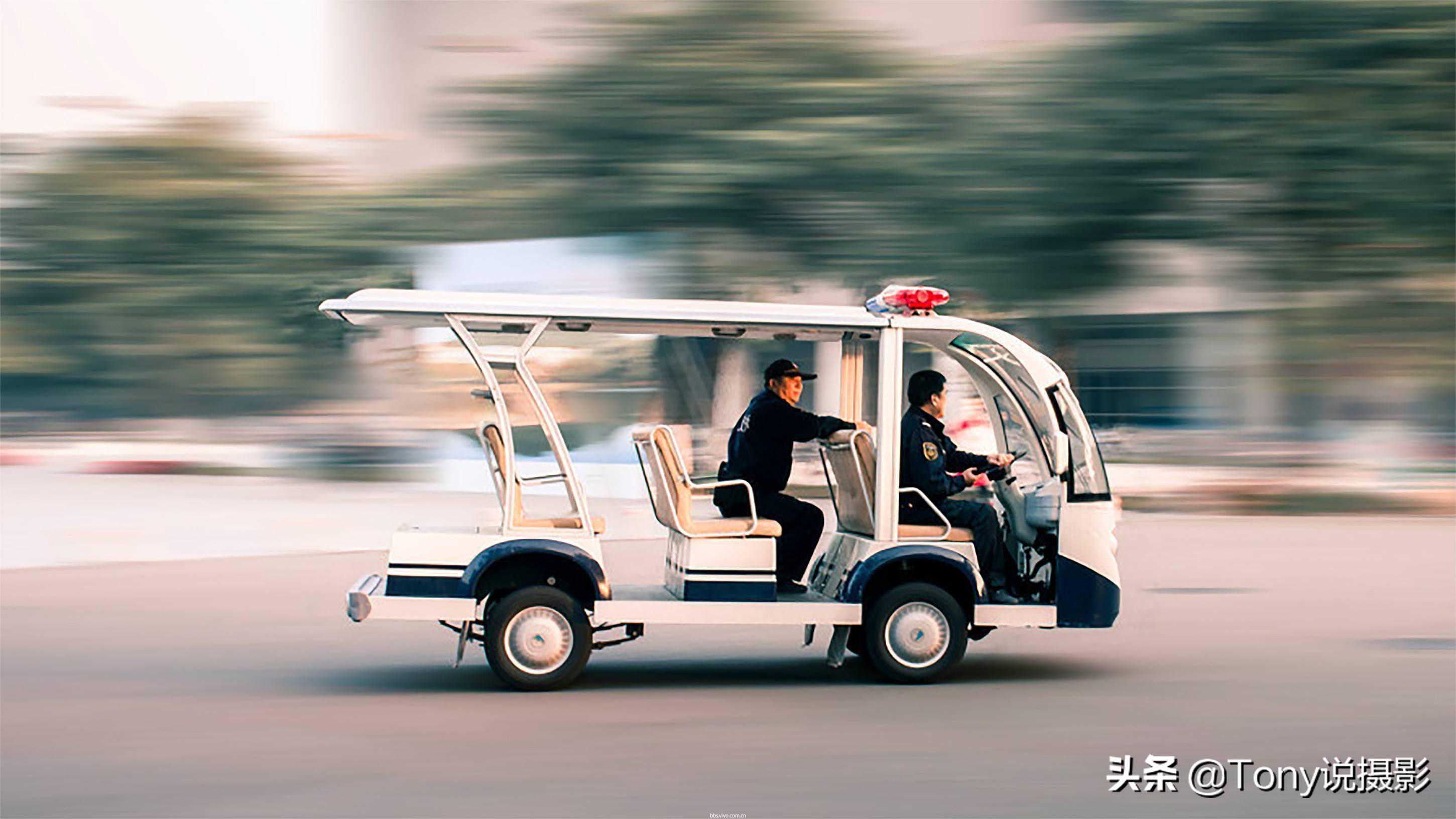 这种方式多用于在车上拍摄两边的汽车,或拍摄前后的汽车等。如下图在道路上拍摄的电瓶车效果,车、人成像清晰,而背景水平方向虚化模糊。
