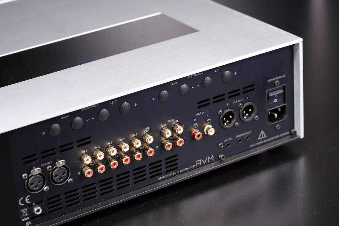 其实和采用相同机箱的还有合并功放,两款机从面板上无法分辨,只有转到机身背板上才能知道哪款是前级,哪款是合并功放。因为前者较后者少了喇叭线接线端子。除此之外,都提供一组XLR平衡和5组RCA高电平模拟输入,一组线路输出。而前级还提供了XLR平衡和RCA单端各一组。在背板的左侧预留了3个仓门,留给对功能有拓展需要的玩家升级之用。也就是说,这部前级是基础版本,厂方额外提供了Phono、DAC等插卡式组件供选购,如果你是喜欢一部机玩到底的极简主义者,AVM基本可满足你的需求。