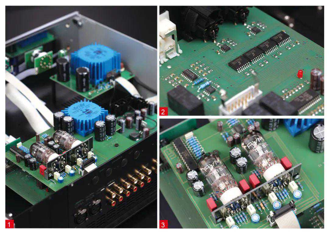 在充满金属光泽与冷冽基调的轻奢外表下,前级却是“外冷内热”的典型代表,通过机壳顶板的咖啡色玻璃,可透视机内结构,尤为吸引眼球的无疑是那两只散发着迷人光芒的电子管。打开机箱,可见布局采用立体架构打造,电源变压器就有两只,分别为晶体管线路与电子管线路供电。信号进入输入端子后先经过OPA134运放做缓冲,然后进入总共4片CS3310-KSZ数字音量控制芯片,此后再进入电子管电压放大线路。为何总共需要用4片CS3310-KSZ呢?这个我也不清楚,按理说一片芯片已经是双通道的高精度控制,即使是平衡线路也仅需两片就可以满足设计要求了。CS3310-KSZ可提供0.5dB的音量步进精度,总可调范围达到127dB,因此可精确控制音量。而且THD-N总谐波失真仅0.001%,动态范围达到116dB,相比传统的机械式音量电位器而言实在先进太多了。