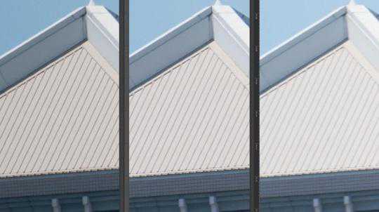 300mm端边缘的分辨率要更为稳定一些,第一张截图中的细节还原还都不错,屋顶的纹路和线条都清晰可见,感觉有超越中心的趋势。虽然分辨率在F16后有所下降,但边缘分辨率并没有像中心一样随着光圈收缩而再度受影响,而是在F16-F29之间形成一个微妙的相似。