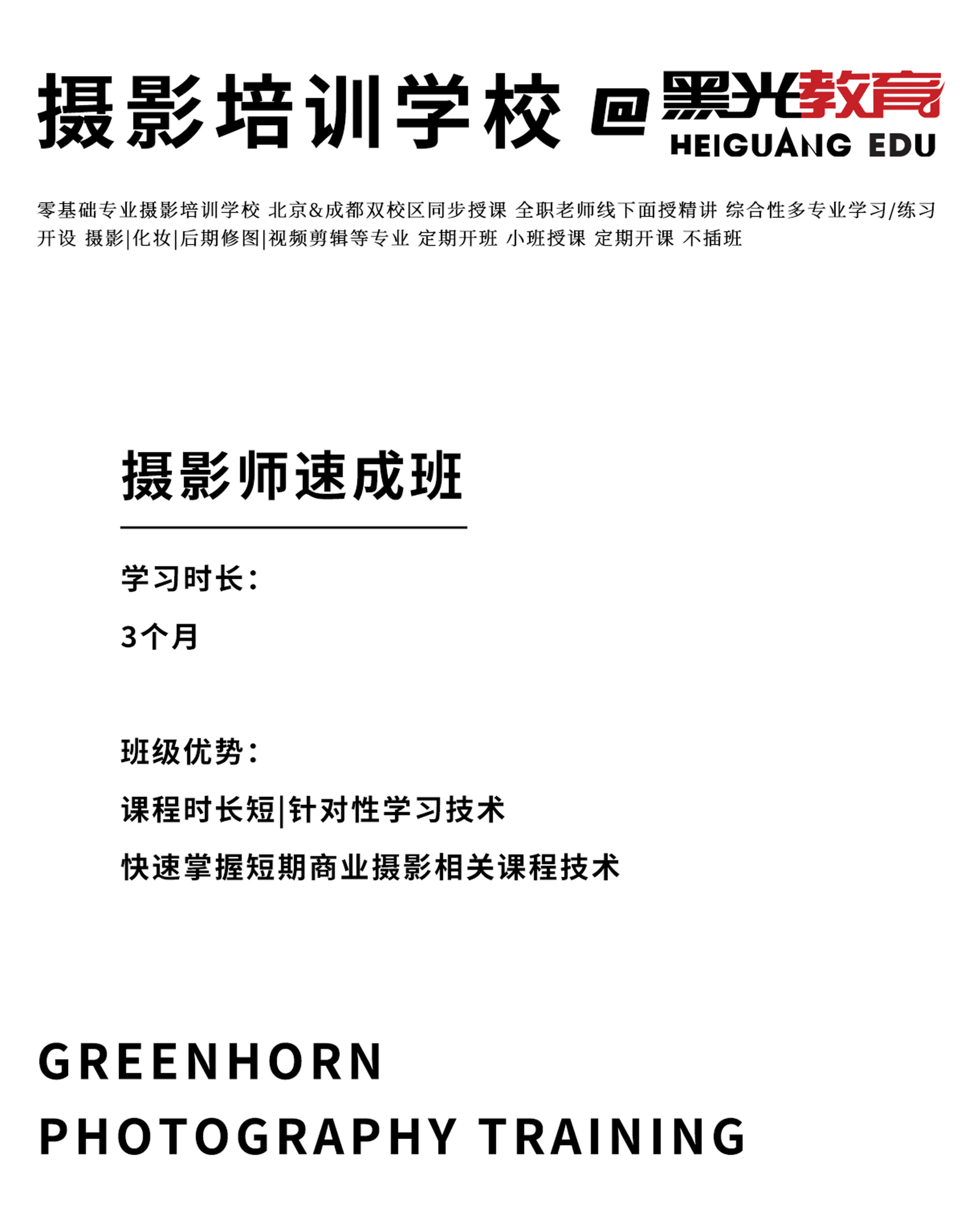 班级优势:课程时长短|针对性学习技术|快速掌握短期商业摄影相关课程技术