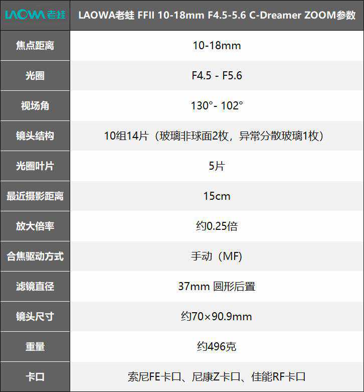 老蛙是一款手动镜头,拥有索尼FE卡口、尼康Z卡口、佳能RF卡口不同选择。镜头结构采用10组14片,其中包括2片玻璃非球面镜片以及1片异常分散玻璃镜片。整镜身仅重496g,搭配轻便的无反相机,让携带更轻松。