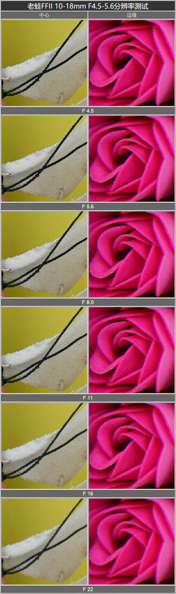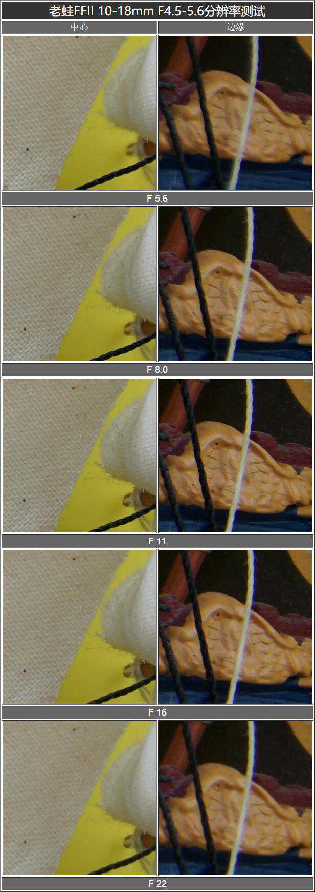 从测试图中我们可以十分明显的看到,当光圈在时画质分辨率最佳。缩小光圈至F11-F16时,分辨率略有下降但仍在可接受范围内。当光圈缩小至F22时,画面细节开始丢失。总体来说老蛙在10mm端时拥有非常优秀的分辨率。