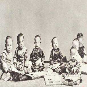 7位萌娃年龄相仿,可爱至极,他们翻看着相册,在照相馆拍下了很生动的合影。