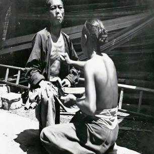 镜头中,一名年迈父亲携子游走于街头,乞讨生计。