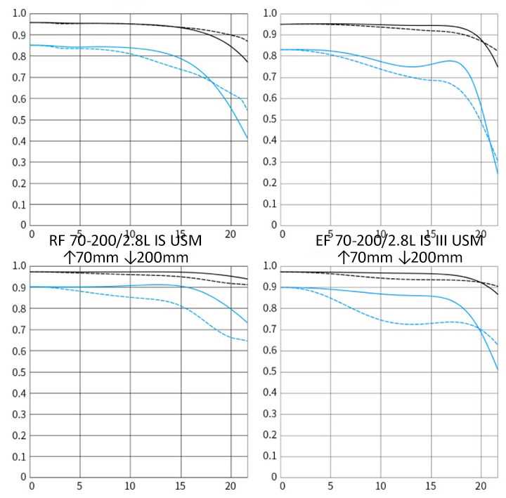▲RF70-200/2.8LISUSM(左)与EF70-200/2.8LISIIIUSM(右)的MTF对比
