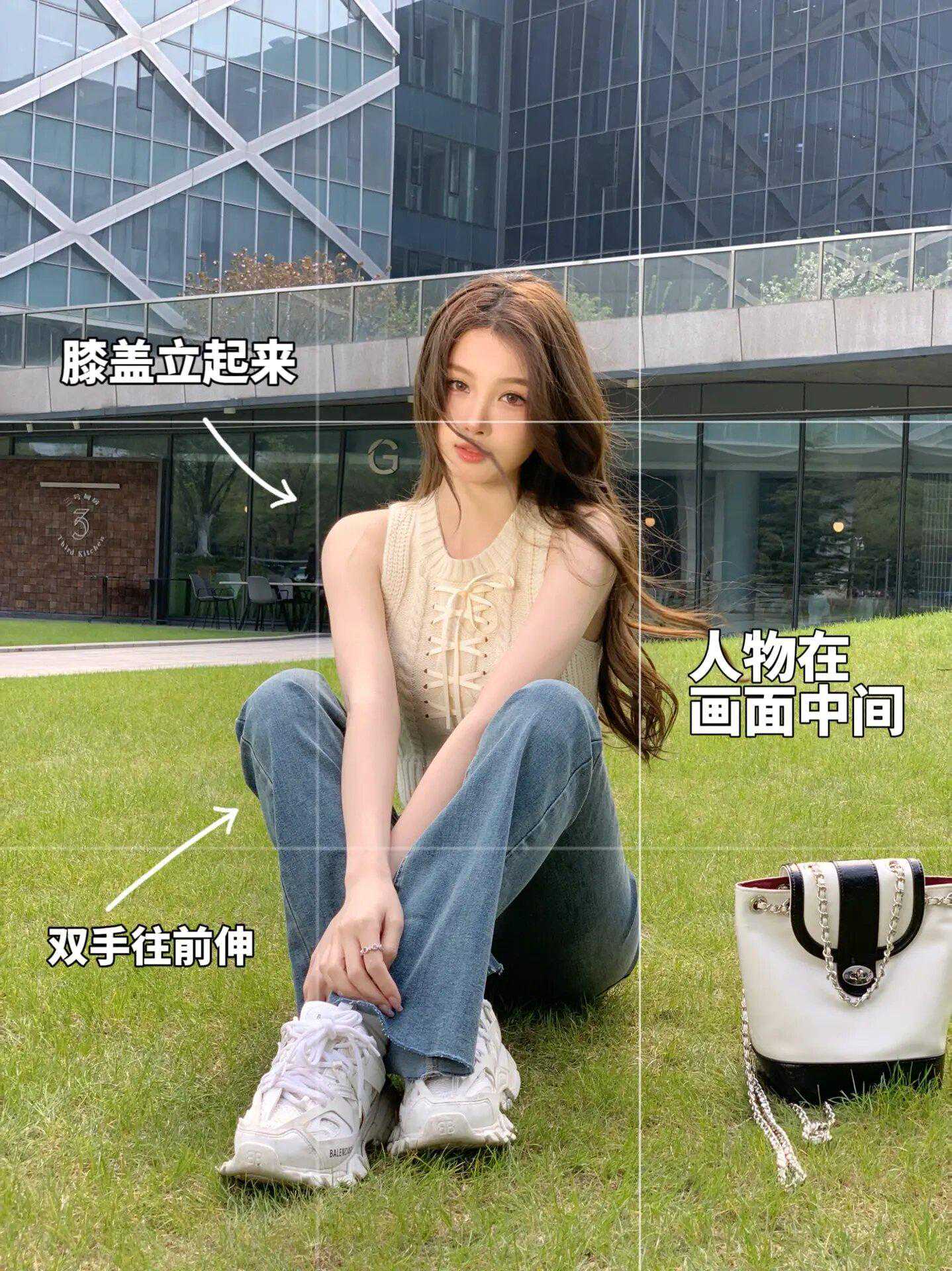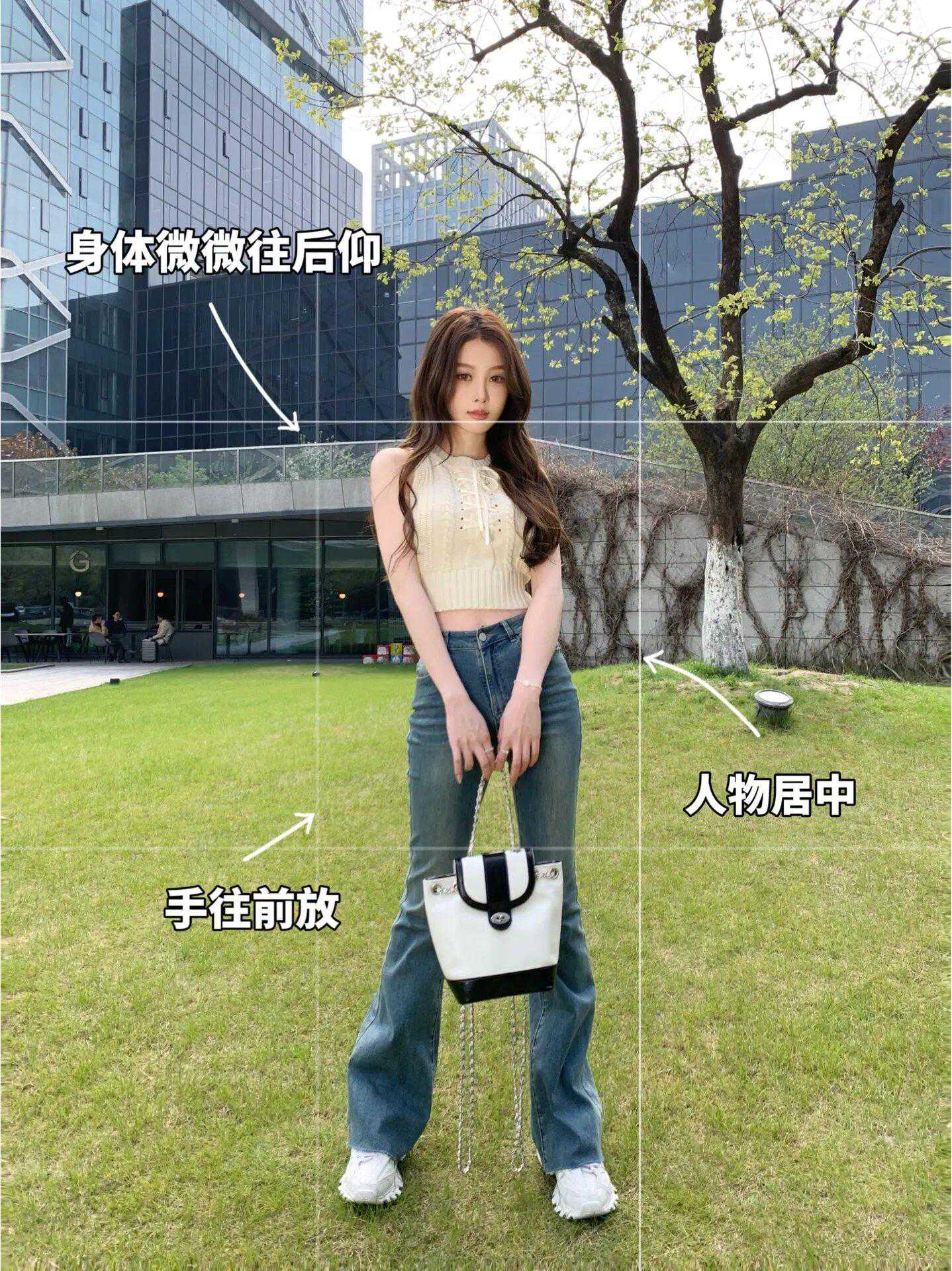草地拍照,可以让自己自然的站在草地上,然后手拿包包往身体前面放,身体稍微往后仰一点点,然后把自己放在画面的中间位置,这样整个构图看起来会很舒服,很简单就能拍得很出片好看!