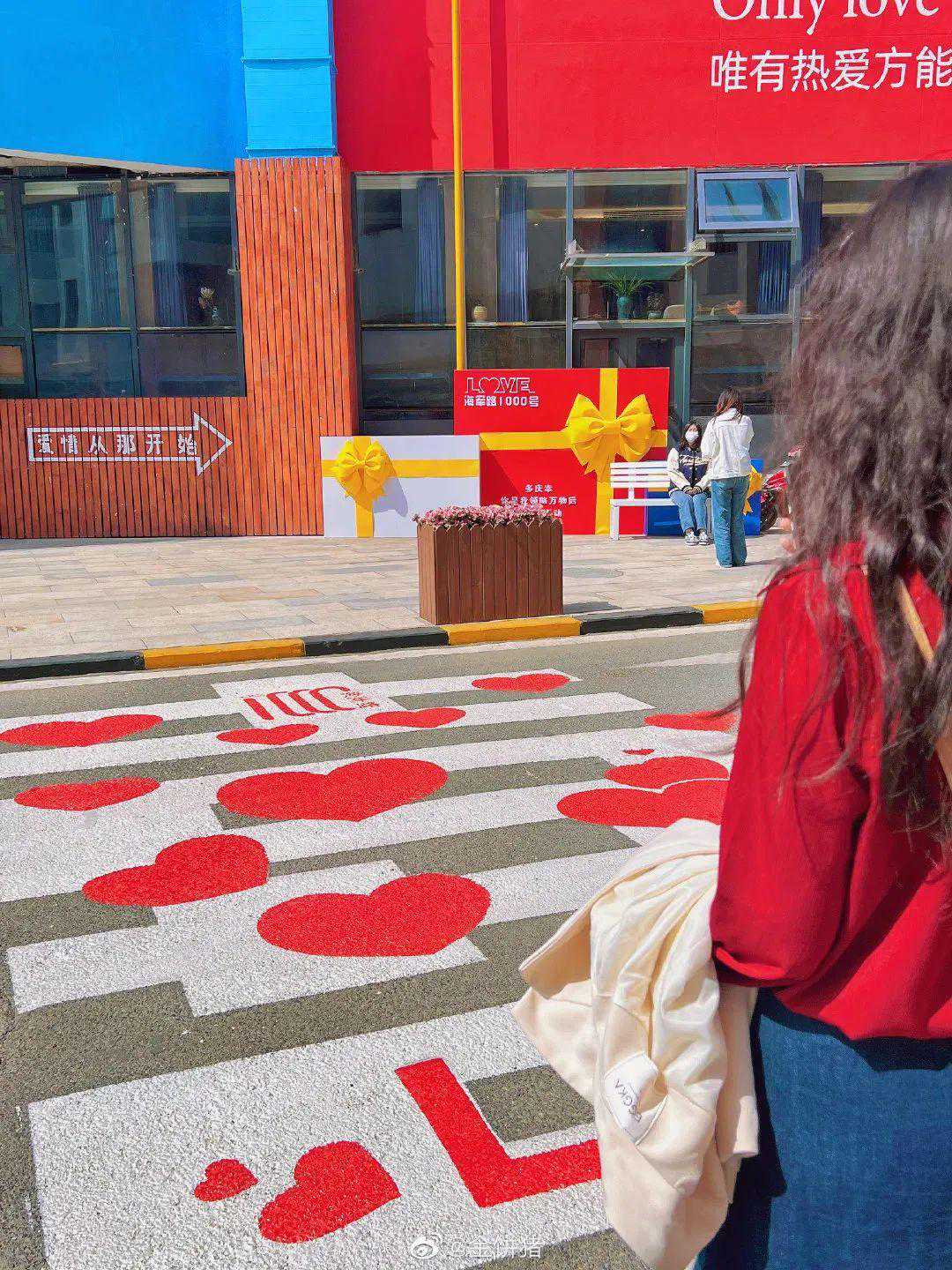 在面朝大海的时尚艺术街区里,有一条专属于爱情的小路,每个角落都有甜腻的惊喜与爱意,爱意满满的“囍”字斑马线、霓虹闪烁的浪漫因子,爱情电影的浪漫大概也不过如此。
