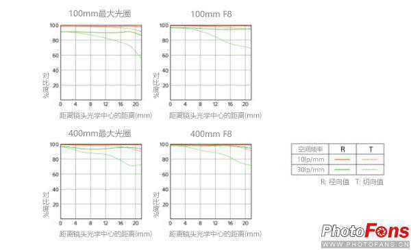 通过对比我们可以看到,这支镜头400mm端中心的各档光圈表现非常平均,收到时画质表现最佳。而边缘的分辨率相对于中心就有所下降,但是总体来说都非常让人满意,最佳光圈同样在
