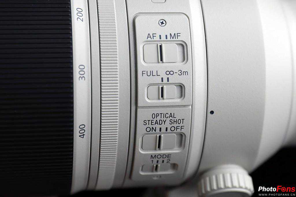 索尼镜身的开关有四个,分别是AF/MF切换开关、对焦范围切换开关、防抖补偿开关和防抖模式切换开关