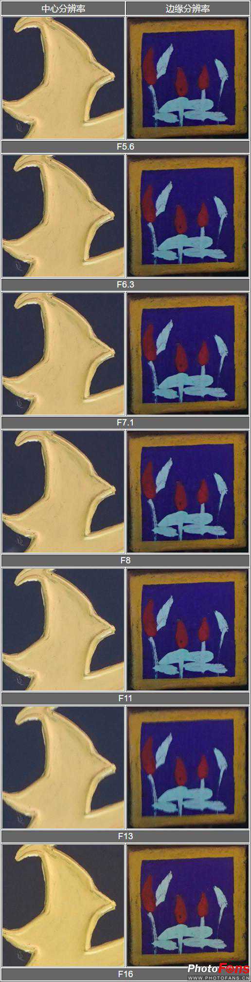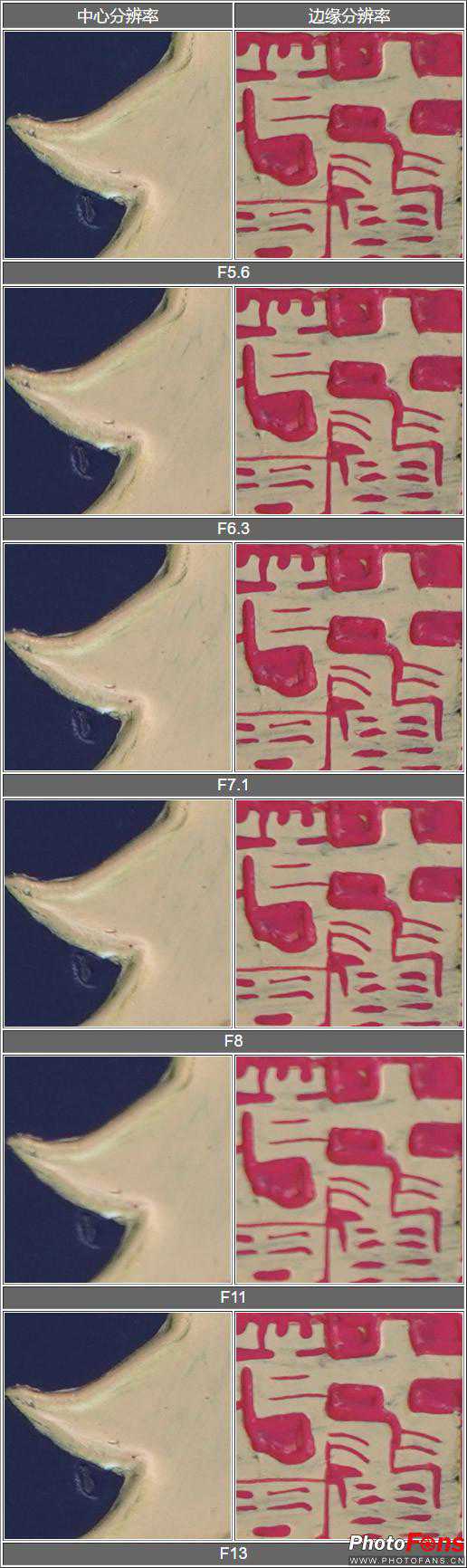 通过对比我们可以看到,这支镜头100mm端中心的各档光圈表现非常平均,收到时画质表现最佳。而边缘的分辨率相对于中心就有所下降,但是总体来说都非常让人满意,最佳光圈同样在。因此,100mm的最佳光圈为。