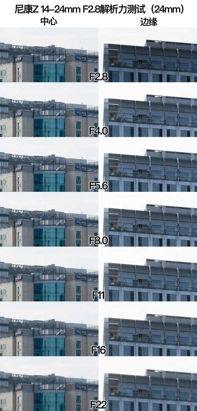 在24mm端,新镜头中心画质依然好于老镜头,特别是全开时,中心画质其实有了很大提升。另外,新镜头在24mm端,边缘画质同样是比F卡口老镜头更出色的。不过需要注意一点,新镜头在24mm端,边缘暗角要比老镜头更重一点。