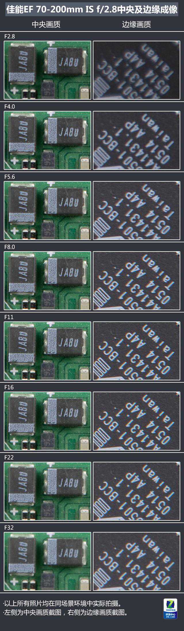 接下来再来看看暗角控制方面,首先是70mm端。可以看到70mm端这枚EF70-200mmf/2.8LISIIIUSM镜头的暗角控制是很不错的,在f/2.8下有轻微暗角,而随着光圈收缩一档光圈后会大幅度降低,而到f/8.0后基本没有边缘暗角的问题了。