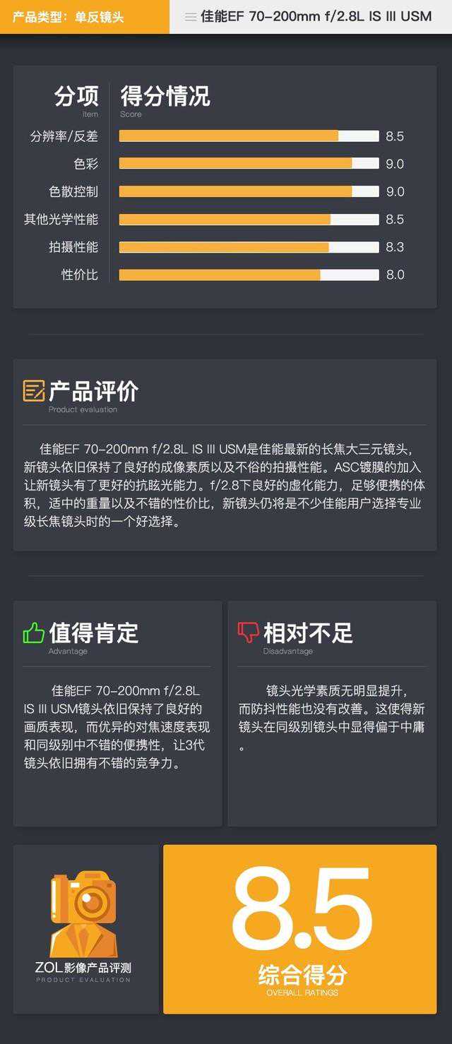 从我们的测试体验不难看出,佳能EF70-200mmf/2.8LISIIIUSM镜头延续了前代的光学设计不无理由,即便是和如今8年后很多新设计的同规格镜头相比,新EF70-200mmf/2.8LISIIIUSM依旧可以说是同级别镜头中表现出类拔萃的。可见这一光学设计的确是非常出众。镜头的画质表现,的确是让人满意的。