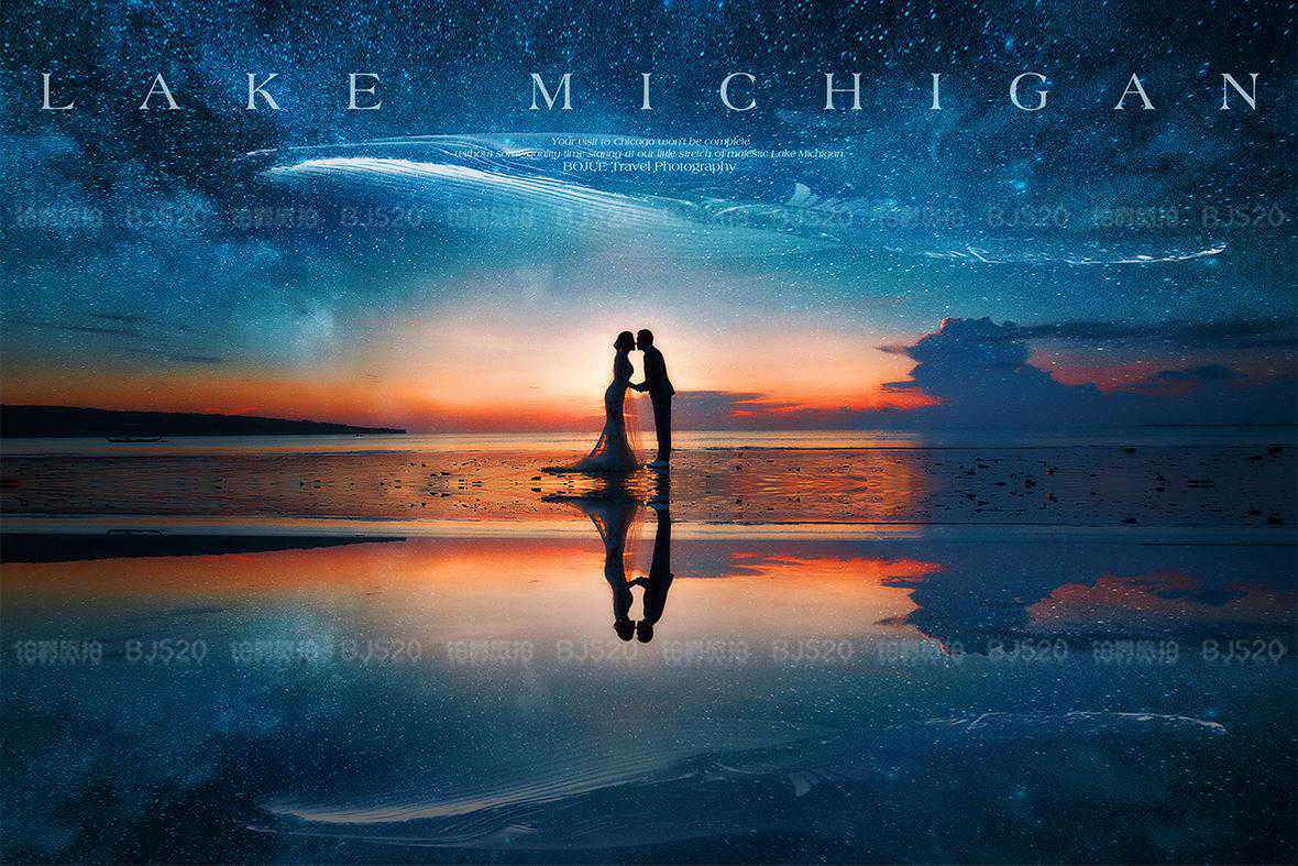 2.这时候,天空并没有完全暗下来,天地间充斥着柔和的散射光,太阳落下的天空处会呈现出品红色的晚霞,而远处的天空又呈现为蓝紫色。通过相机的长时间曝光,会将天空的色彩夸大,梦幻异常。如果周围光线还足够柔和、明亮,甚至可以不用为新人补光。若是想突出表现晚霞,还可以采用剪影的方式,需要注意的就是对于人物姿态和轮廓的控制。