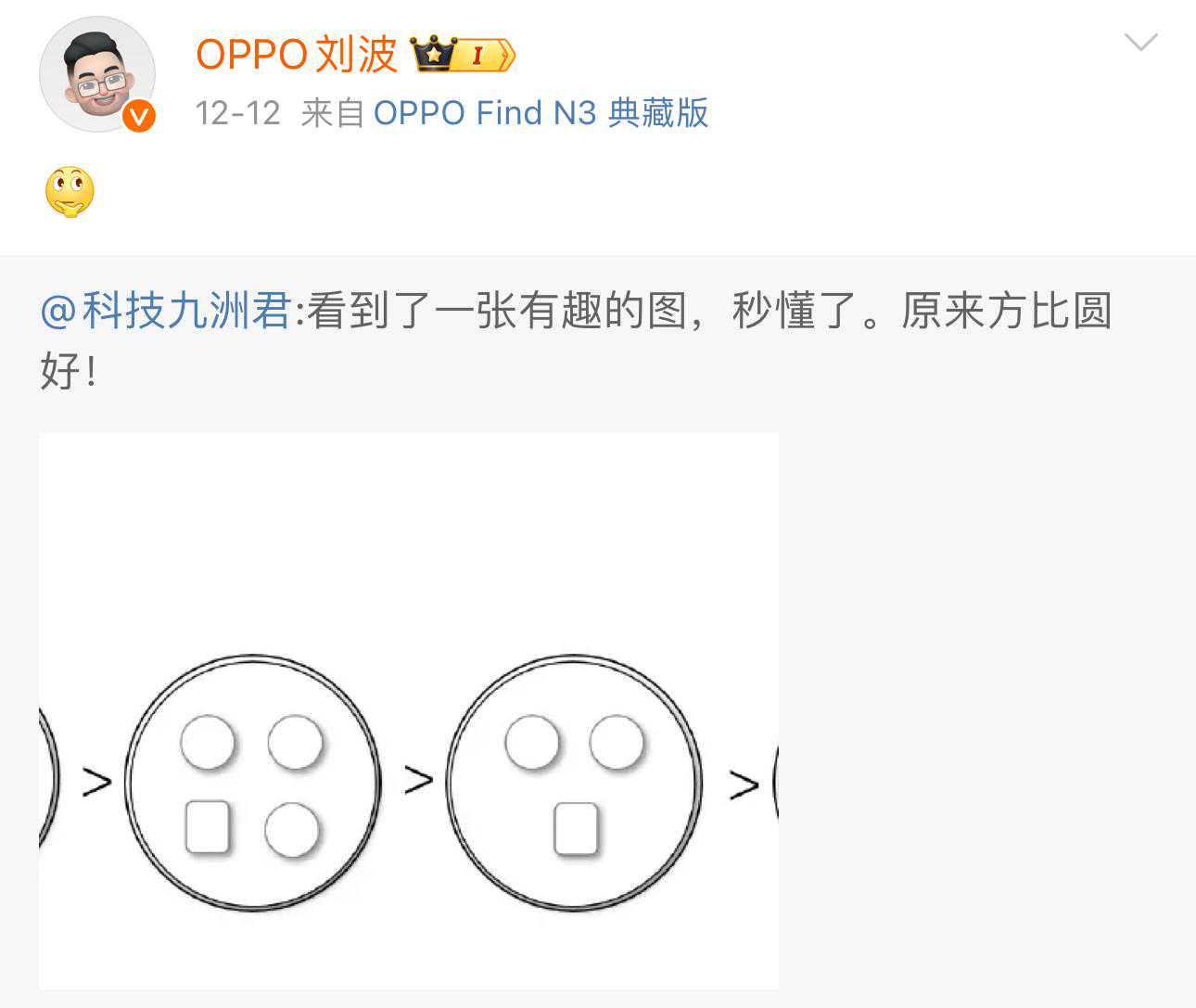 前几天,OPPO首席产品官刘作虎在社交平台分享了一款新镜头,另一位高管刘波也转发了一张镜头排布的对比观点,认同“方比圆好”。