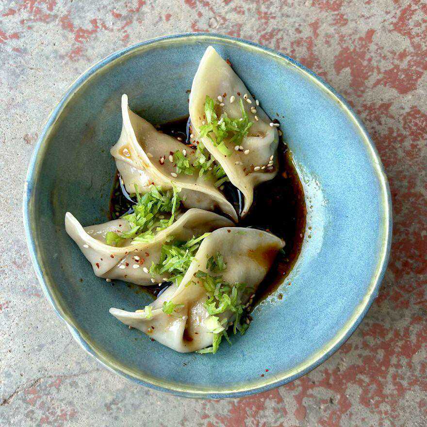 2、瓷碗里盛着4个手工饺子,形状像花一样漂亮,可惜数量太少,完全不够吃啊……