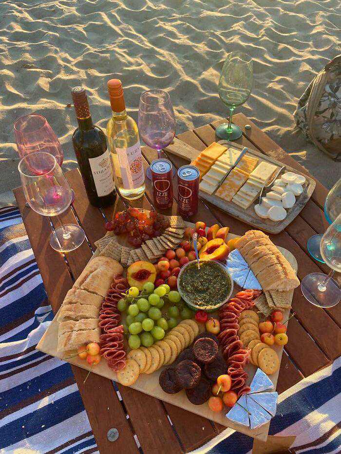 21、沙滩上,我享受着悠闲的时光,面前摆放着各式诱人的美食。