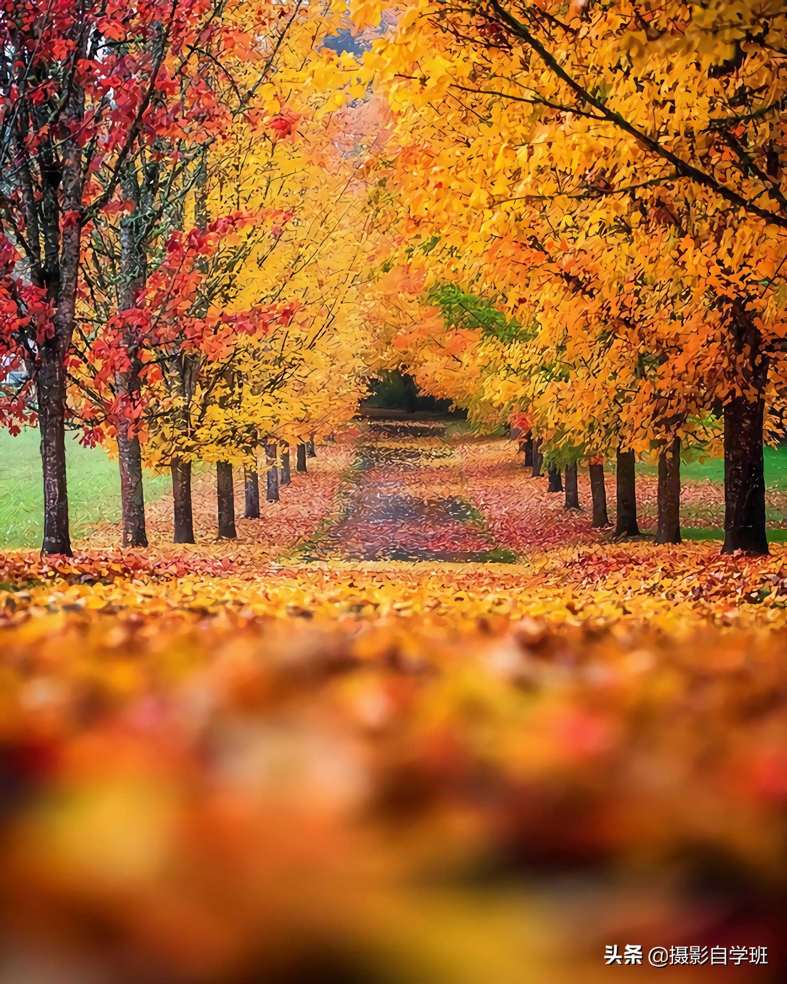 另外还可以用树叶做前景,比如上图,拍摄时,可以扬起一堆落叶,同样对焦在远处,扬起落叶时,要距离镜头近点,这样离镜头近的落叶,相对就能更虚化了。或者直接像下图这样,找一处够得着的树叶作为前景,树叶好看的话,就让树叶占据画面大部分面积,对焦在树叶上就行了。远处有太阳或者其他景物,增加画面的层次感。不要从取景器中看镜头,以免灼伤眼睛。