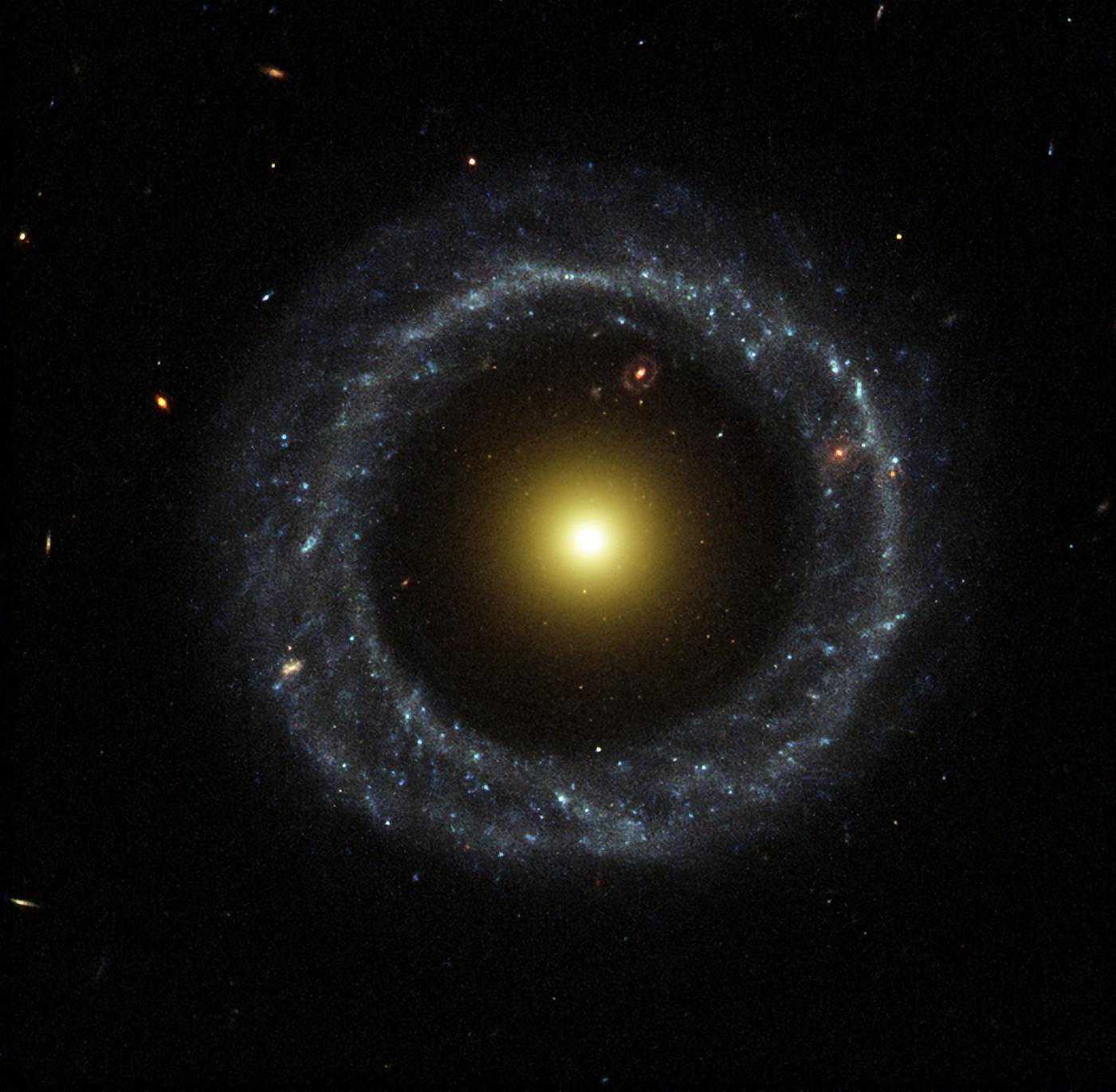 它拥有一个中央老恒星组成的内核和外围年轻蓝色恒星组成的圆环,中间是一道黑暗的裂缝,形态非常奇特。