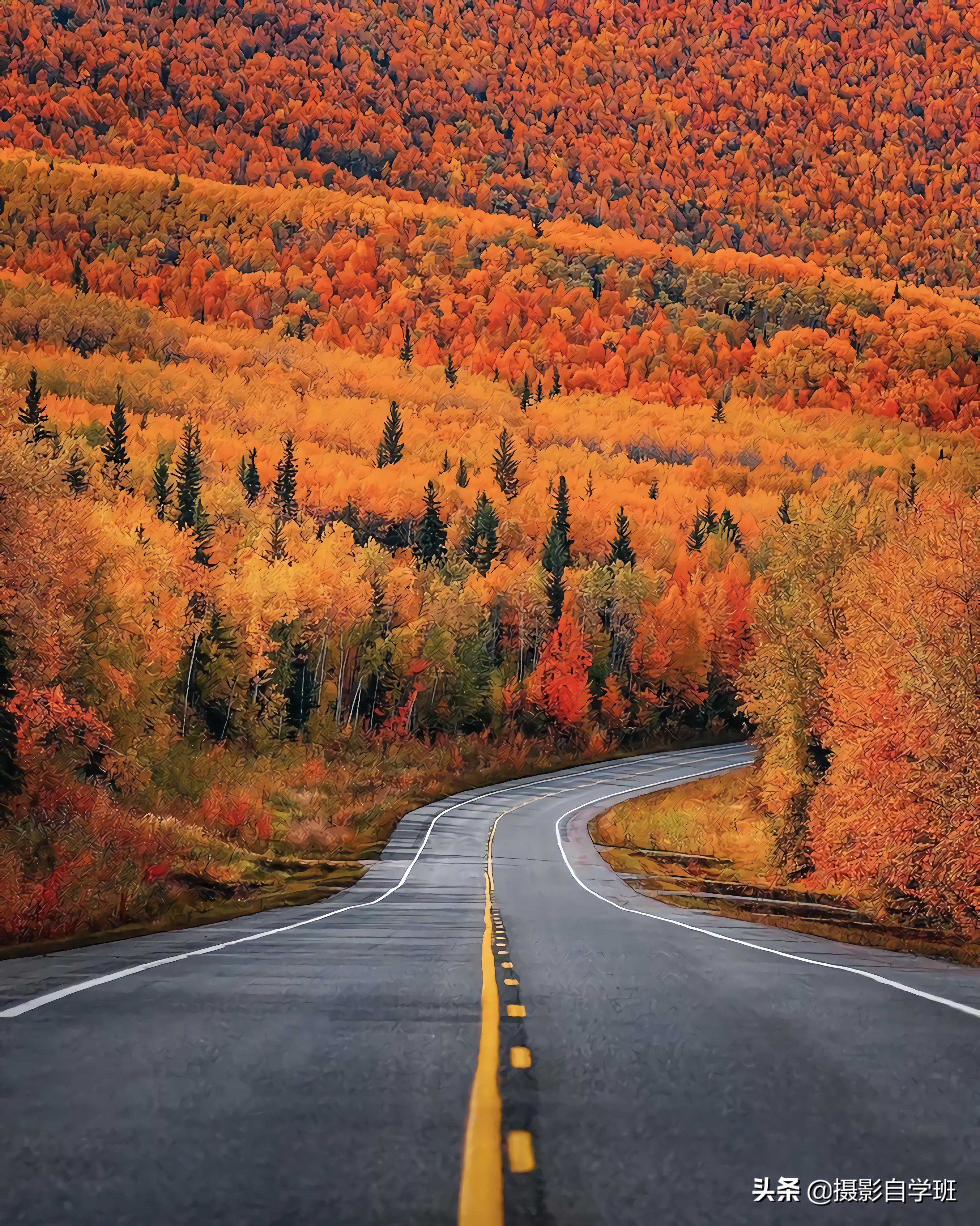 如果你所处的角度,没办法让你顺着路拍,只能截取其中的一段,像上图这种铁轨,此时你就要适当调整方位,尽量让铁轨,位于照片接近对角线的位置,这样可以增加照片的结构感。而如果可以顺着路延伸到方向拍,无论春夏秋冬哪个季节的景色,在遇到路的时候,都顺着路拍,这样照片更有纵深感。
