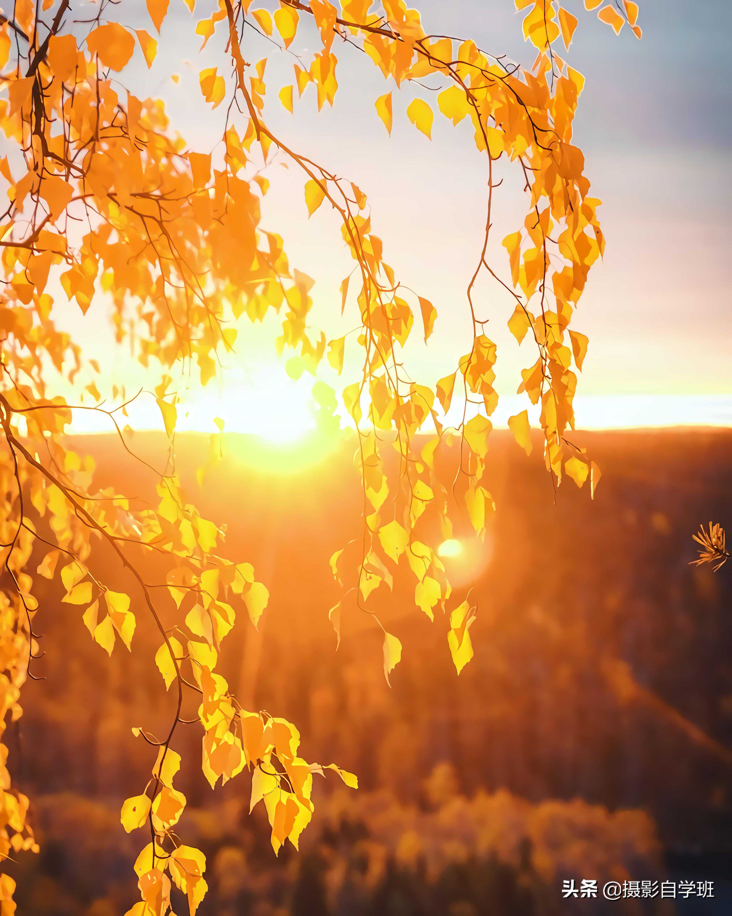 另外还可以用树叶做前景,比如上图,拍摄时,可以扬起一堆落叶,同样对焦在远处,扬起落叶时,要距离镜头近点,这样离镜头近的落叶,相对就能更虚化了。或者直接像下图这样,找一处够得着的树叶作为前景,树叶好看的话,就让树叶占据画面大部分面积,对焦在树叶上就行了。远处有太阳或者其他景物,增加画面的层次感。不要从取景器中看镜头,以免灼伤眼睛。