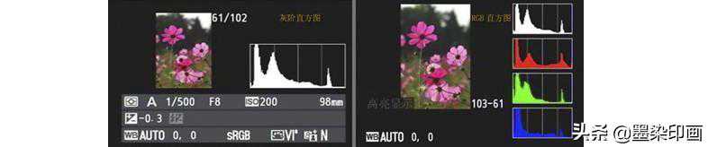 在相机的照片预览模式中,我们可以同时看到R(红)、G(绿)、B(蓝)每个通道的直方图,以及最上面叠加后的RGB直方图。