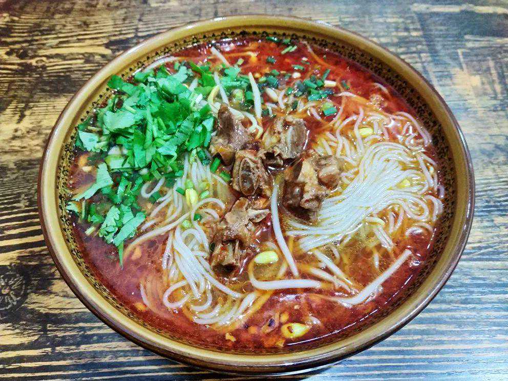 新疆米粉,能非常好地吸收汤汁,里面的芹菜恰到好处地平衡了口感,有时候里面还会加入鸡肉和馕。